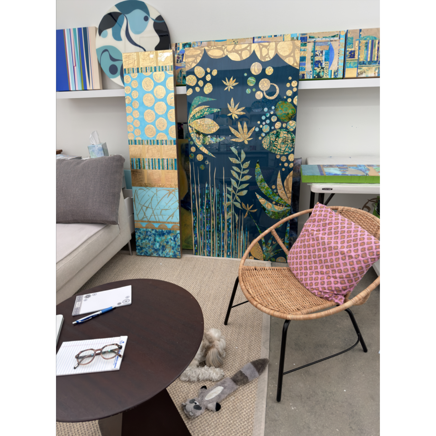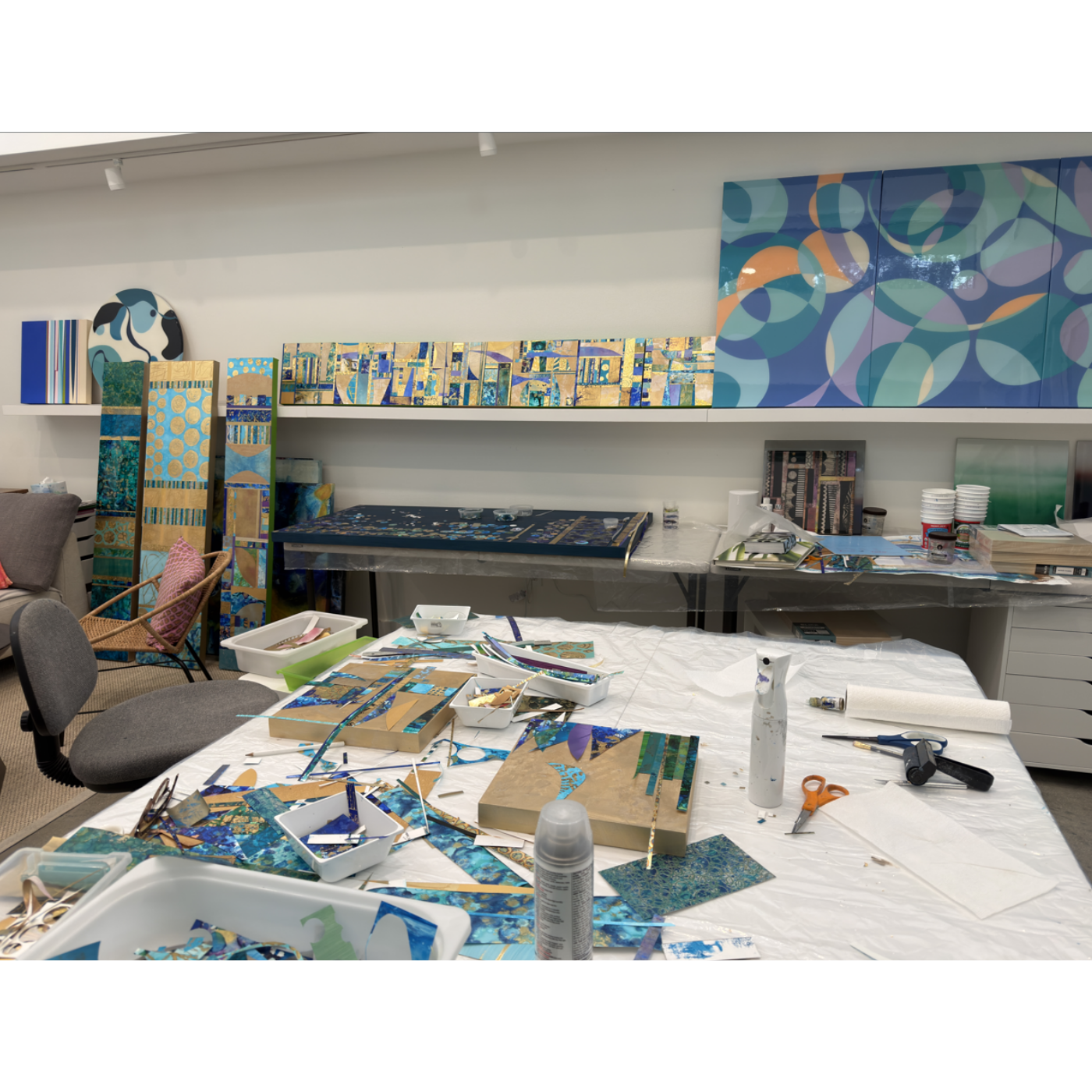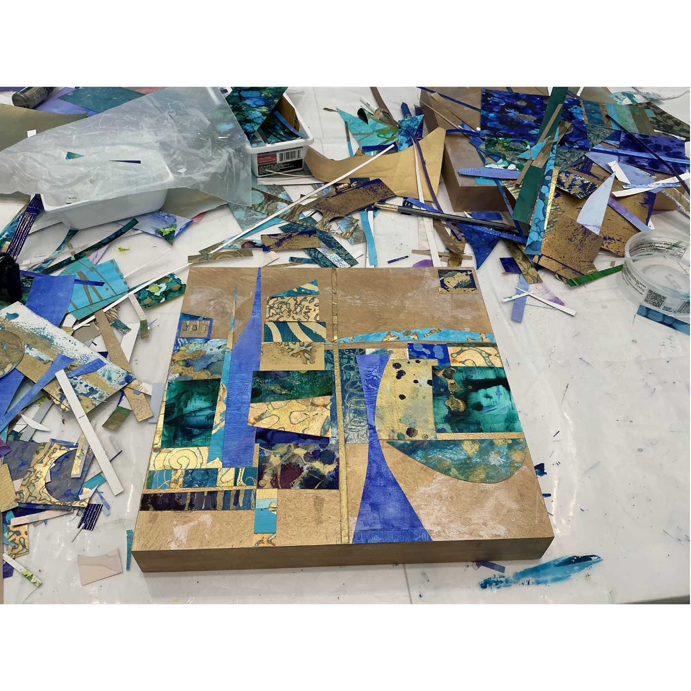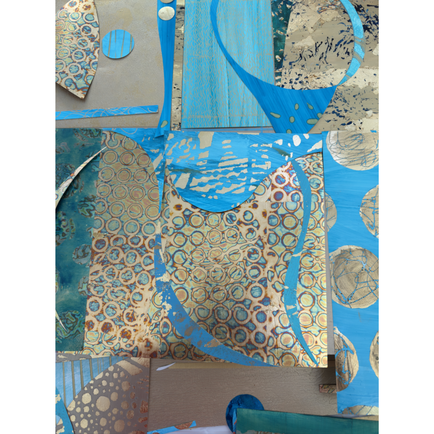 My process begins with creating my own collage papers, which form the foundation of each work. From there, I build the surface in layers, allowing elements to be partially concealed and revealed. Resin is applied in the final stages to unify the surface and create depth and luminosity.